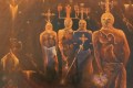 The Beings in the painting of “Cosmic Connections” are Apache Dancers in ceremonial spirit. Glowing symbols are floating and spinning, emerging out of the vortex and off the dancers’ bodies themselves. They are the embodiment of our star brothers who watch over us. The blue flowers are from a dream time journey into another dimension on another planet, the star brother holds them as a gift he brings from home. The others hold curative tools of power from other worlds, gifts to channel and aid.